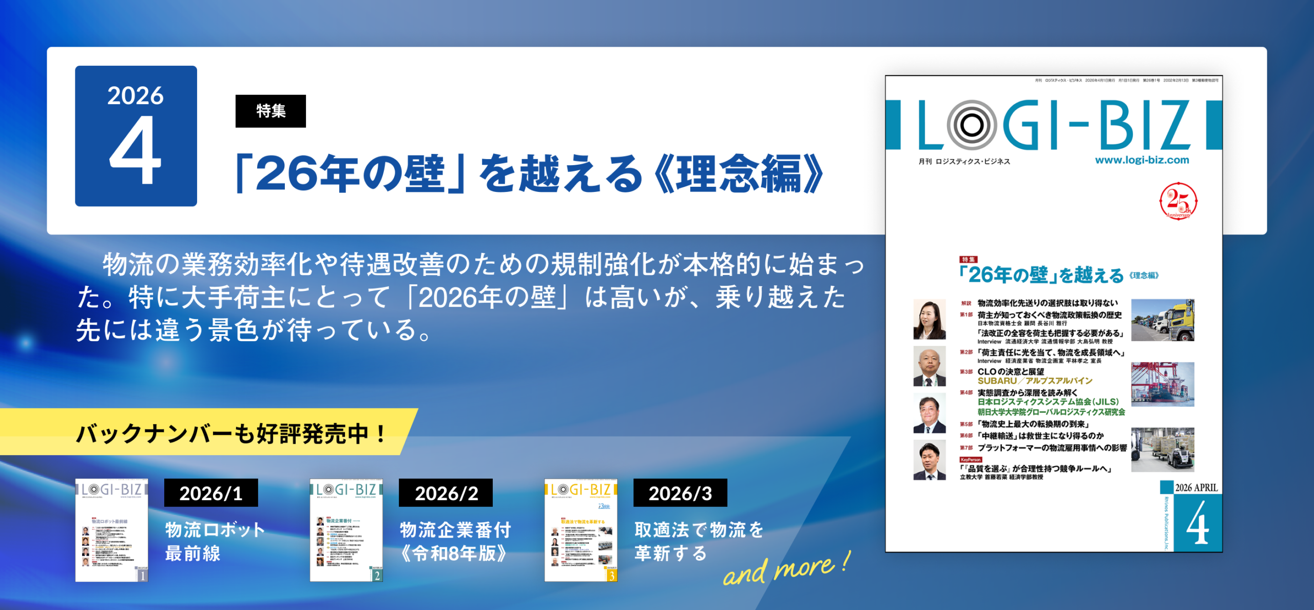 前任の大矢昌浩が創刊した「月刊ロジスティクス・ビジネス(LOGI-BIZ)」は、おかげ様で2026年に25周年となり、多くの方々にご愛読いただいております。